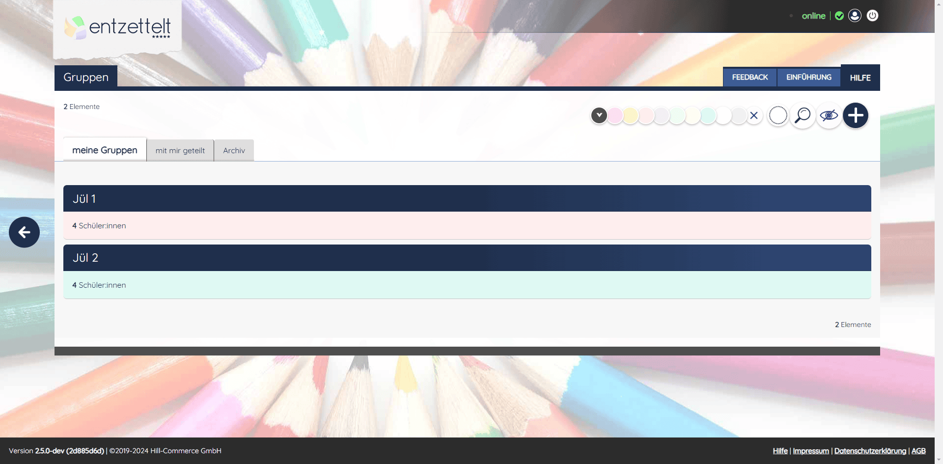 Solltest du bereits Gruppen angelegt haben, findest du hier eine übersichtliche Liste mit den wesentlichen Informationen: Name der Gruppe und die Anzahl von Schülern und Schülerinnen, die du dieser Gruppe zugeordnet hast. Gruppen werden mit ihrer jeweils angelegten Farbe hinterlegt.
