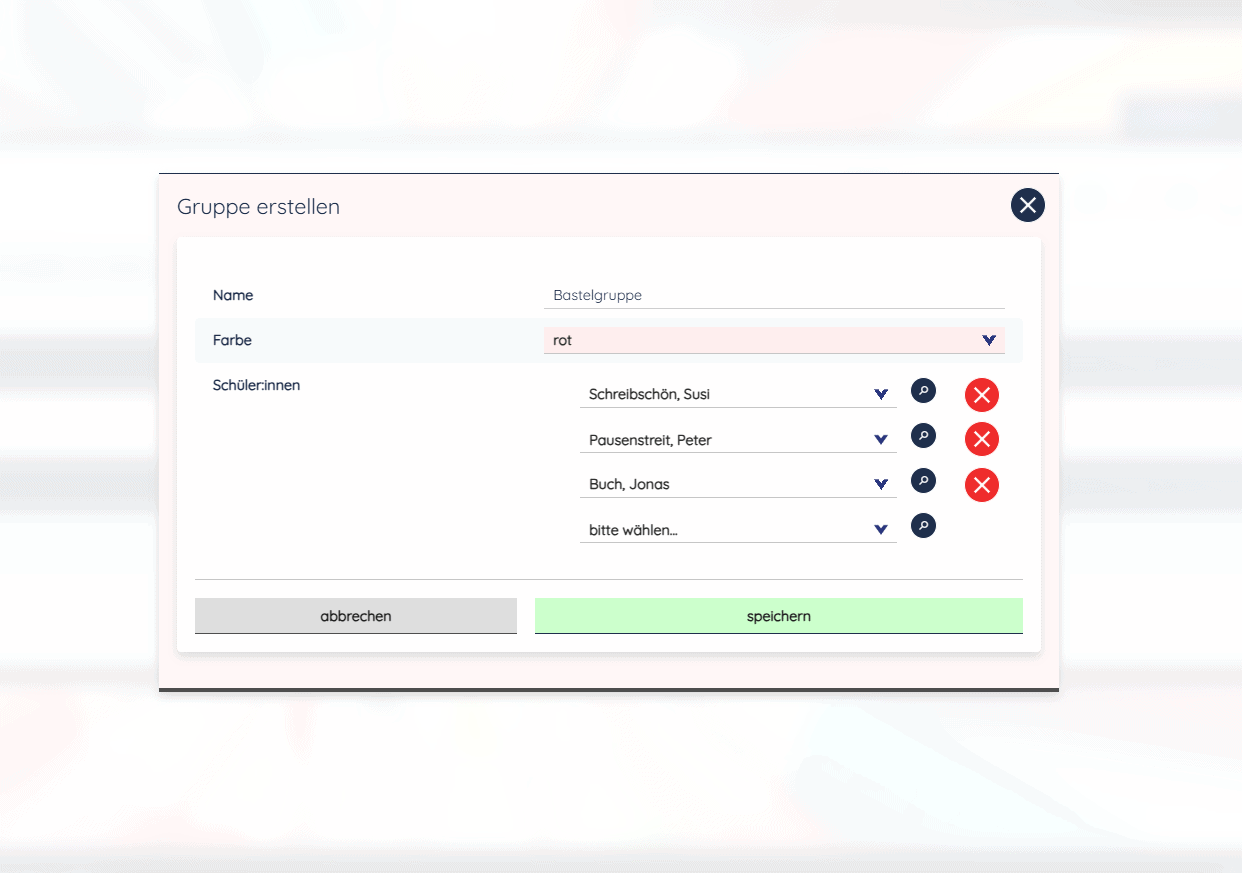 Um einen Schüler zu der Gruppe hinzuzufügen, wähle ihn einfach aus der Dropdown-Liste aus. Möchtest du einen weiteren Schüler oder eine weitere Schülerin hinzufügen, klicke auf das blau hinterlegte „+“ neben der Dropdown-Liste und wähle den entsprechenden Eintrag aus. Wenn du einen Schülerdatensatz aus der Gruppe entfernen möchtest, klicke auf das rot hinterlegte „-“ neben dem Eintrag.
