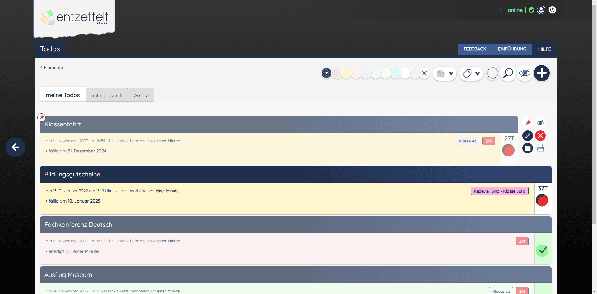 Solltest du bereits Todos angelegt haben, findest du hier eine übersichtliche Liste mit den wesentlichen Informationen: Was ist wann zu erledigen und – falls zutreffend – wie lange ist die Aufgabe schon überfällig? Jede Aufgabe wird mit der Farbe hinterlegt, die du beim Anlegen festgelegt hast.