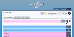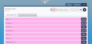 Solltest du bereits Schüler oder Schülerinnen angelegt haben, findest du hier eine übersichtliche Liste mit den wesentlichen Informationen: Nachname, Vorname und – falls zutreffend – den Namen der Klasse. Auch das Geschlecht lässt sich anhand der Farbe leicht erkennen. Während die Daten von Schülerinnen rosa hinterlegt werden, werden männliche Schüler blau und Diverse gelb hinterlegt.